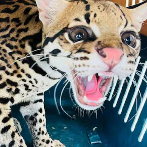 En una imagen difundida por las autoridades se observa al tigrillo, visiblemente estresado dentro de una jaula de transporte. Se prevé que las autoridades ambientales evalúen su estado de salud para coordinar su posterior reinserción en el bosque seco tropical, si es que esta aún posee la capacidad para sobrevivir por su cuenta.