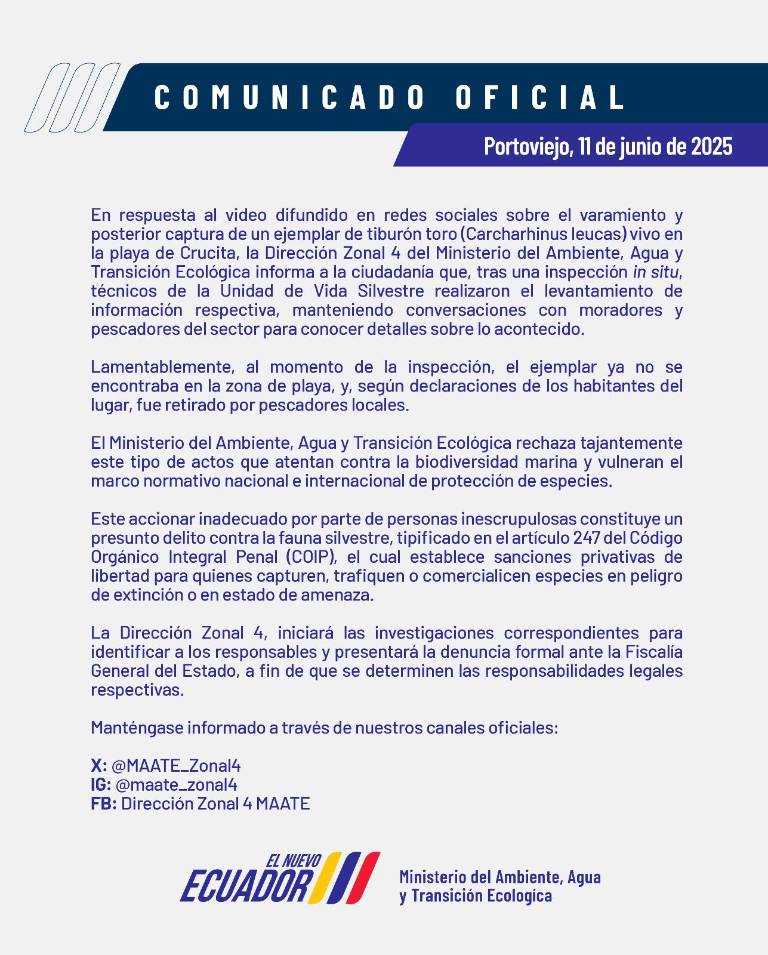 En su comunicado, el Ministerio del Ambiente, Agua y Transición Ecológica (MAATE) rechazó este tipo de acciones, señalando que representan una amenaza directa para la biodiversidad marina y constituyen una violación del marco legal, tanto nacional como internacional, que protege a las especies marinas.