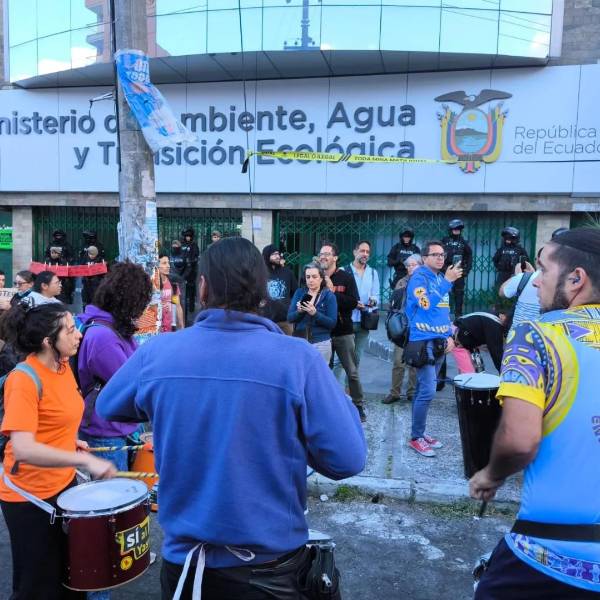 Con tambores, pancartas y consignas, cientos de personas se reunieron este martes 5 de agosoto frente a las oficinas del Ministerio del Ambiente, en el norte de Quito, para expresar su rechazo a recientes decisiones del Gobierno Nacional que, aseguran, ponen en riesgo la protección del medioambiente y los derechos de la naturaleza.