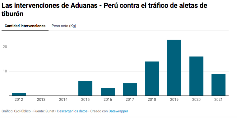 De acuerdo a la información proporcionada por Aduanas a OjoPúblico, desde el 2012 se han realizado 71 intervenciones –desde incautaciones, inmovilizaciones y hallazgos– a más 110 toneladas de cargamento de distintas especies de tiburones (aletas y troncos). La modalidad: las empresas buscan trasladar de Ecuador a Perú aletas de tiburón de origen ilegal o sospechoso e ingresarlas a territorio peruano para exportarlas desde aquí.