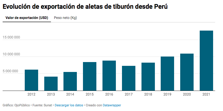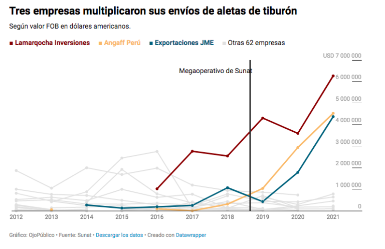 Durante la pandemia la exportación de aletas de tiburón hacia China, Hong Kong y Singapur se incrementó y alcanzó cifras históricas en 10 años. Un análisis a los datos de exportaciones realizado por OjoPúblico revela que, si bien meses después de las intervenciones del 2018, las exportaciones cayeron; luego aumentaron rápidamente, hasta que el 2021 alcanzaron un pico histórico. Lo exportado de Ecuador a Perú entre el 2020 y 2021 representa el 62% de todo lo exportado por Perú en este mismo periodo. Tres de las empresas que más envíos realizaron tienen antecedentes por intervenciones de Aduanas cuando intentaban trasladar aletas desde Ecuador. A inicios de febrero dos empresarios han sido condenados por tráfico ilegal de aletas.