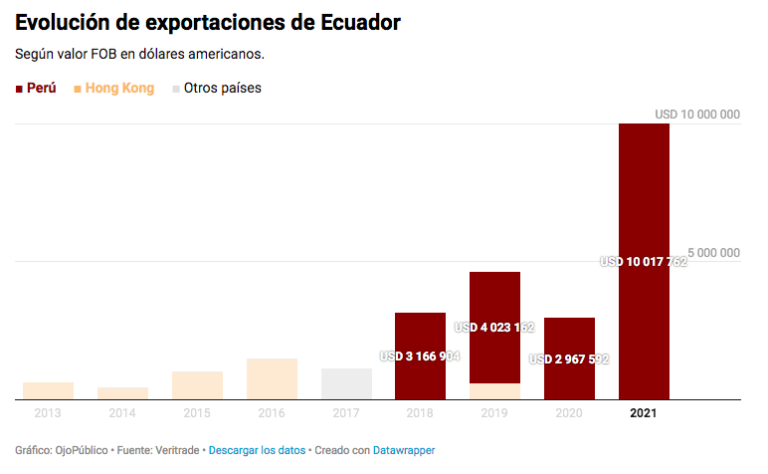 OjoPúblico también analizó las exportaciones de aletas de tiburón de Ecuador, otro de los países sudamericanos con importantes ventas de estos recursos hacia el mercado asiático. Entre 2013 y 2021, este país exportó un total 1.113 toneladas por un valor FOB de USD 25,6 millones. De esta cantidad, el 16% tuvo como destino Hong Kong, y el 78% tuvo como destino el Perú, desde donde luego se reexporta a Asia.