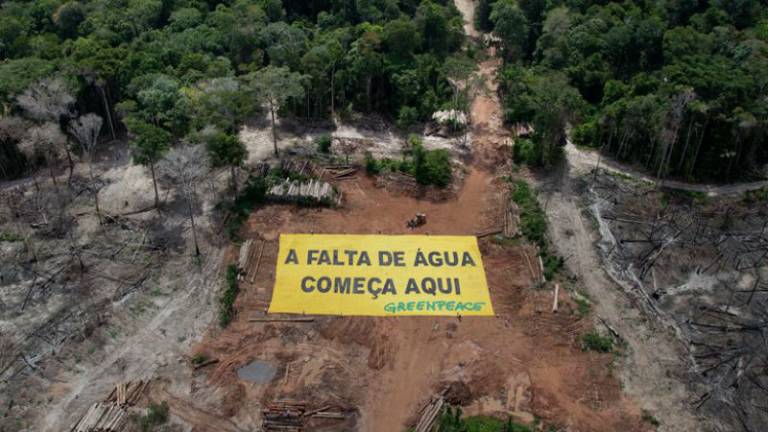 Río de Janeiro (Brasil).- "La falta de agua comienza aquí", en la Amazonia brasileña deforestada. El mensaje se puede leer en una gigantesca pancarta que Greenpeace colocó en un área arrasada presuntamente por madereros ilegales del tamaño de 504 campos de fútbol.