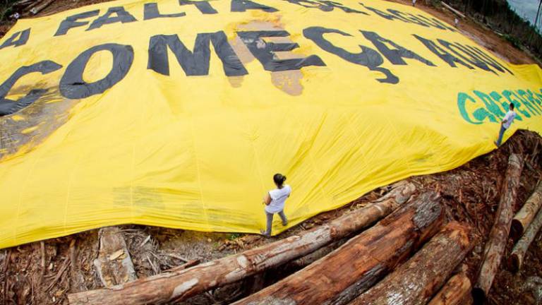 "Mantener la selva en pie es nuestro pasaporte para el futuro, un inventario de fichas para amenizar los efectos severos del cambio climático", dijo Cristiane Mazzetti, de la campaña Amazonia de Greepeace, en el comunicado que divulgó la ONG este jueves tras colocar el cartel.