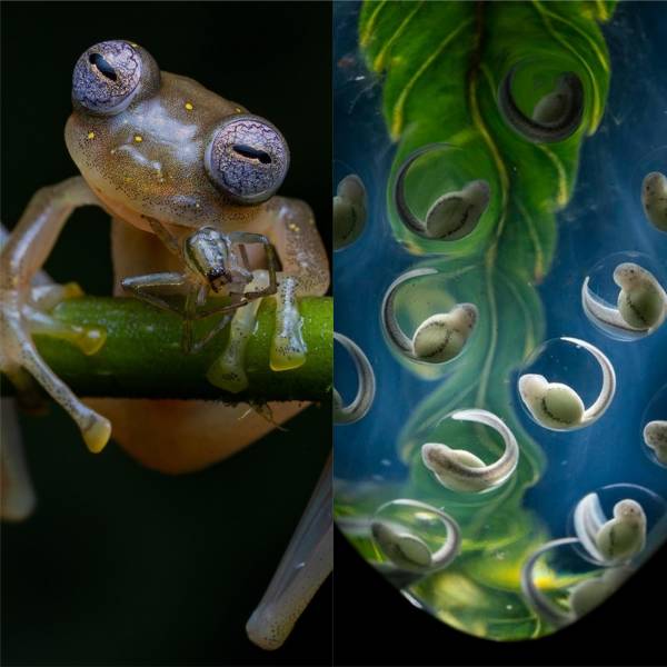 Después está la foto de los embriones de una rana de cristal de Wiley, endémica de la Amazonía ecuatoriana, que cuelgan de la punta de una hoja de helecho. Cuando los huevos eclosionan en renacuajos, caerán al arroyo de abajo y continuarán su desarrollo, señala el medio internacional.
