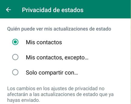 Algo que sirve de manera complementaria, la opción para que los estados sean visualizados por las personas que quieras: Estados/ Privacidad de estado/ Elegir la opción (mis contactos, mis contactos excepto..., sólo compartir con...).