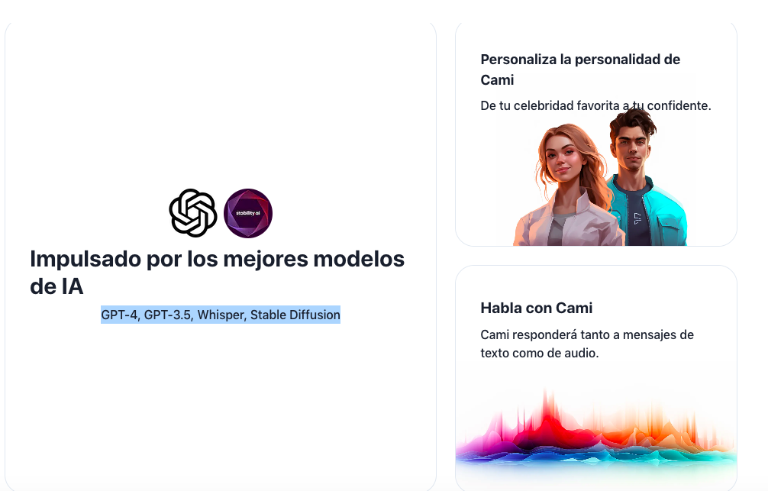 Además, el bot utiliza varios motores de inteligencia artificial para ofrecer variedad de interacciones. Cami es impulsado por GPT-4, GPT-3.5, Whisper, Stable Diffusion.