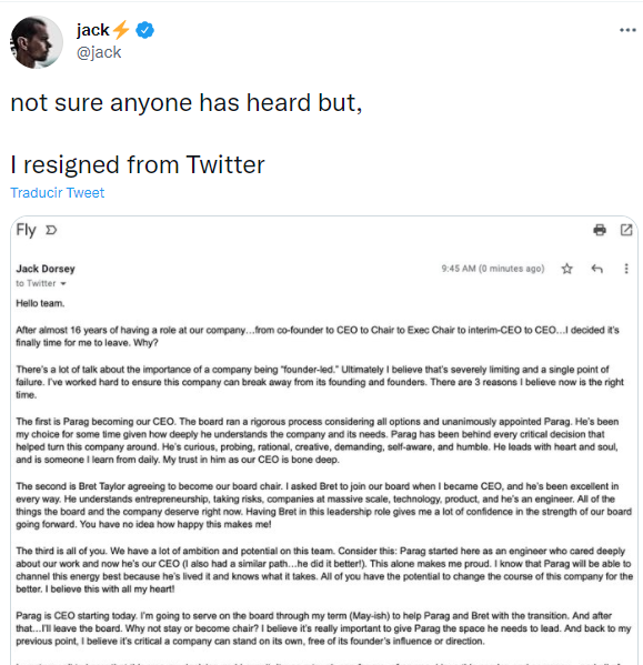 Jack Dorsey, fundador de la plataforma Twitter, anunció mediante la misma red social que ha presentado la renuncia a su cargo. Este comunicado causó un 11% de incremento en las acciones de la compañía.