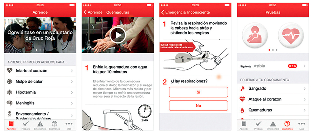 La Cruz Roja Ecuatoriana, así como las representaciones de la institución en otros países, ofrece una aplicación con información sobre qué hacer en caso de emergencia. Accidentes, enfermedades y fenómenos naturales son algunas de las situaciones previstas, que incluye animaciones, videos, referencias, casos e información general para aprender a dar primeros auxilios desde el celular. También ofrece botones para comunicarse con los servicios de emergencia. Está disponible de forma gratuita para iOS y Android. Una vez descargada, no necesita conexión a Internet para funcionar.