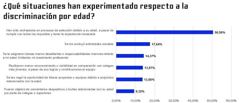 La investigación arroja otros resultados sobre discriminación etaria, como que un 17,6% se ha sentido excluido de actividades sociales y un 14,4% asegura haber recibido asignaciones menos desafiantes que sus pares más jóvenes.