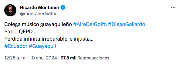 El cantante venezolano Ricardo Montaner se unió a los mensajes de condolencia de varios artistas en memoria del músico guayaquileño Diego Gallardo, conocido artísticamente como Aire del Golfo, quien perdió la vida víctima de una bala perdida en medio de una balacera en el sector Ceibos del norte de Guayaquil, el martes 9 de enero de 2024.