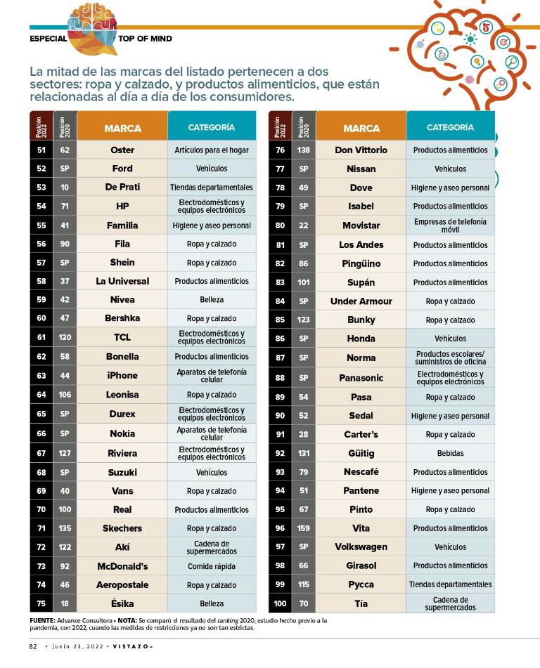 En el ranking se aprecia un repunte de las marcas dedicadas a la imagen, como ropa y calzado, consistente con el regreso a la presencialidad. Otras categorías muestran una reducción y un regreso a las marcas que plantean promesas básicas para satisfacer necesidades cotidianas.