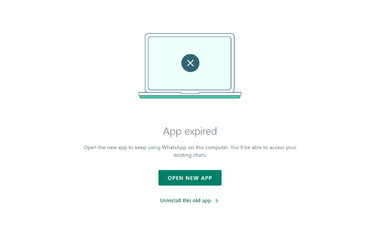 Al momento de ingresar a esta versión, recibirán un aviso indicando la necesidad de descargar la versión más reciente de la aplicación si desean continuar chateando desde sus computadoras.