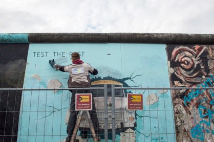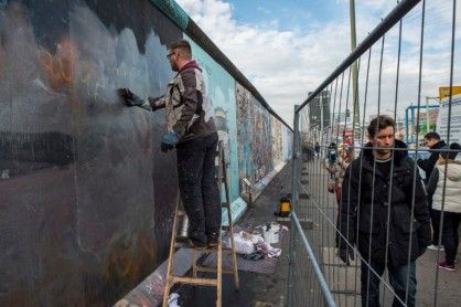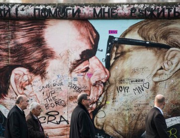 Este año en un fragmento del muro se visualiza el beso entre el ruso Leónidas Brezhnev y el alemán Erich Honecker. AFP