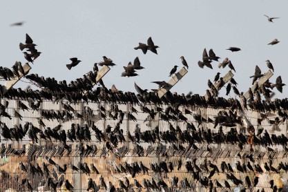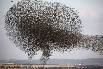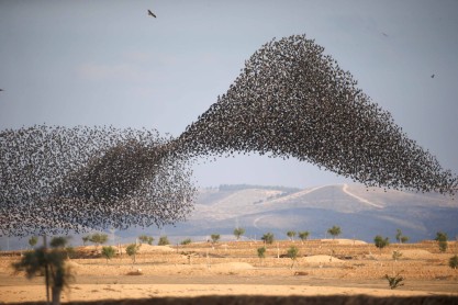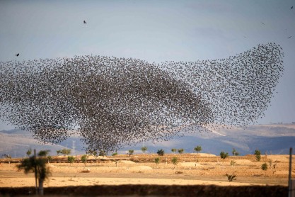 Estorninos migratorios se ven a través del cielo cerca de la aldea de Beit Kama en el sur de Israel