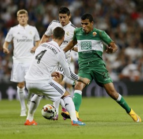 El delantero brasileño del Elche Jonathan de Jesus (d) con el balón ante el defensa del Real Madrid Sergio Ramos y el centrocampista colombiano James Rodriguez (c)
