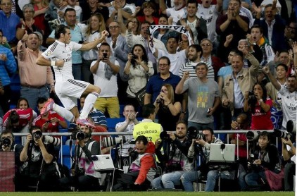 El centrocampista galés del Real Madrid Gareth Bale celebra el gol marcado al Elche