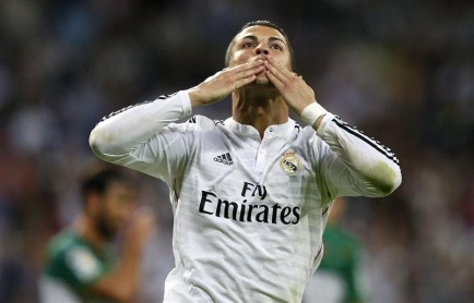 El delantero portugués del Real Madrid Cristiano Ronaldo celebra su segundo gol ante el Elche