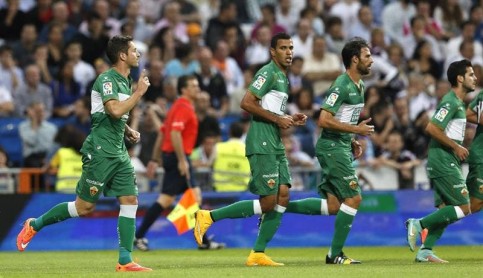 El defensa del Elche Edu Albacar (i) celebra con varios compañeros el gol marcado de penalti al Real Madrid