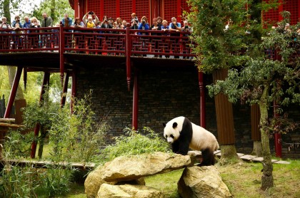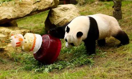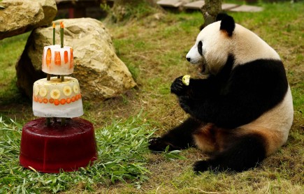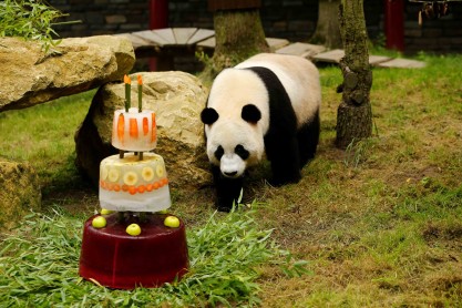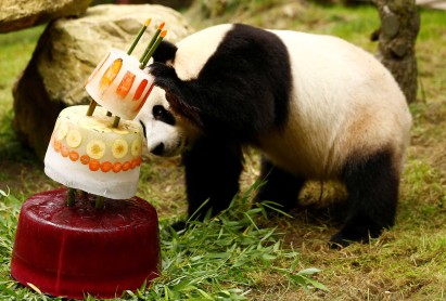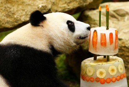 Xing Ya, el macho de los dos pandas gigantes, invade su helado de cumpleaños celebrando su cuarto cumpleaños en el Zoológico de Ouwehands en Rhenen, Holanda
