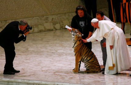 El papa pudo contemplar una serie de actuaciones de acróbatas y contorsionistas, y escuchar la música de varias orquestas no profesionales e incluso un domador presentó a Francisco un cachorro de tigre, que se sobresaltó cuando el papa acercó su mano. Tras tranquilizarlo con un biberón de leche, el animal se dejó acariciar a continuación. Pero, al parecer, no fue quien más se asustó. "Ustedes pueden también asustar al papa haciéndole acariciar este tigre... ¡Son muy fuertes!", dijo el pontífice. (AFP)