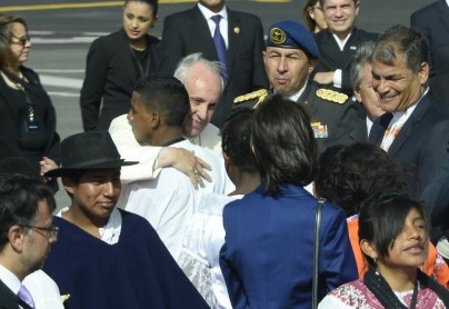 En su histórica llegada fue recibido por el presidente Rafael Correa. El papa ofreció también unas palabras, entre las que dijo: "Vengo como testigo de la misericordia de Dios y la fe en Jesucristo".