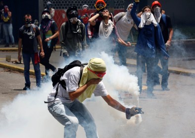 Un partidario de la oposición recoge un bote de gas lacrimógeno durante los enfrentamientos con las fuerzas de seguridad en una protesta contra el presidente Nicolas Maduro en Caracas