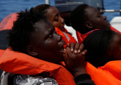 Un migrante reacciona después de ser rescatado por el migrante ONG con sede en Malta en el Mediterráneo central de la ciudad costera libia de Sabratha