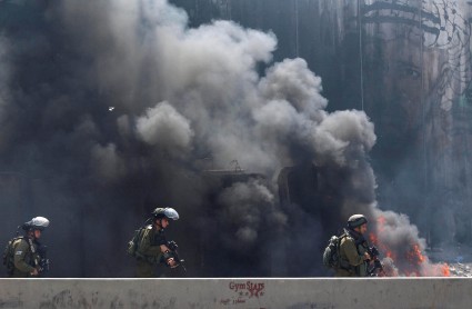 soldados israelíes toman posiciones durante los enfrentamientos con manifestantes palestinos tras una protesta en solidaridad con los presos palestinos detenidos por Israel