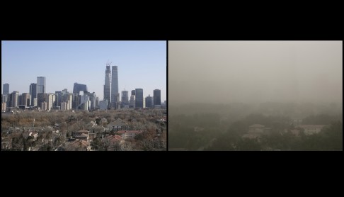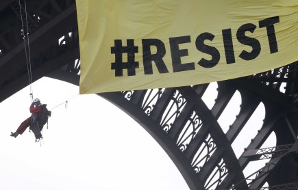 Activistas del grupo ecologista Greenpeace despliegan una bandera gigante frente anti-Nacional sobre la Torre Eiffel en París