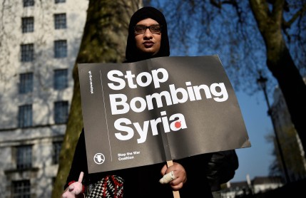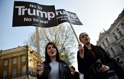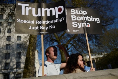 Personas sostienen carteles durante una manifestación organizada por la Coalición Alto a la Guerra de los Estados Unidos para protestar contra la decisión del presidente Donald Trump para lanzar ataques contra objetivos sirios, en el centro de Londres, Gran Bretaña.