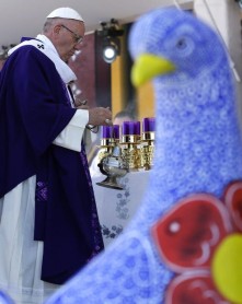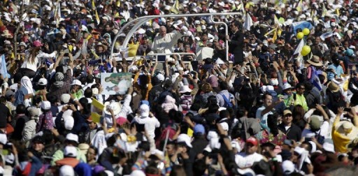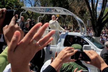 El pontífice arribó en helicóptero desde la capital estatal de Tuxtla Gutiérrez, y abordó el "papamóvil" para recorrer el centro deportivo con capacidad para 100.000 personas donde millares de indígenas lo aguardaban desde horas de la madrugada, envueltos por la gélida neblina de la montaña del sur de México.