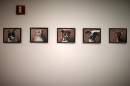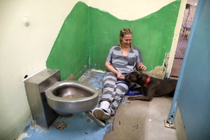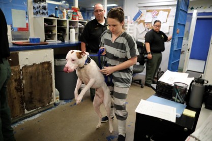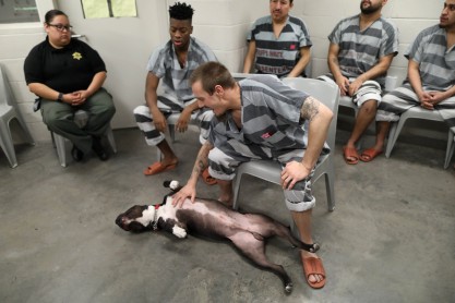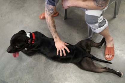 Los internos interactúan con un perro en el programa de extensión de cárcel de la Unidad de MCSO Animal Safe Haven (MASH) en Phoenix, Arizona, Estados Unidos