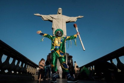 Un hombre vestido con los colores de la bandera de Brasil posa delante de la estatua del Cristo Redentor en Río de Janeiro (Brasil). YASUYOSHI CHIBA (AFP)