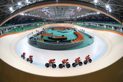 El equipo femenino chino de ciclismo en pista rueda por una de las curvas peraltadas del Velódromo Olímpico de Río de Janeiro (Brasil). ERIC FEFERBERG (AFP)