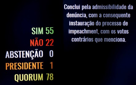 El 12 de mayo de 2016 por la mañana se realizo la votación en el Senado para decidir si Dilma Rousseff debería ir a juicio político. El resultado final fue de 55 votos a favor y 22 en contra siendo apartada del gobierno durante 180 días (mientras se realiza la investigación) y el vicepresidente Michel Temer asumió la presidencia a las 12:00 pm de ese mismo dia.