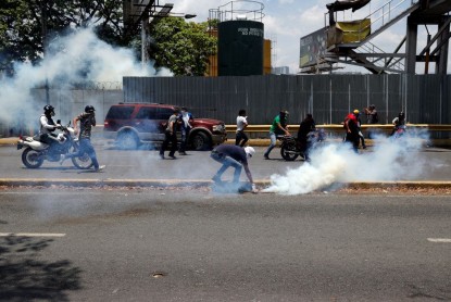 Policías y militares arrojaron bombas lacrimógenas contra miles de manifestantes que atendieron el llamado de Guaidó a salir a las calles a respaldar a los uniformados que se rebelaron contra el presidente Nicolás Maduro en el sector de Altamira, cerca de la base La Carlota.