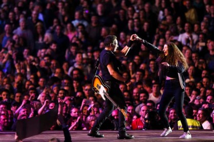 UN BAILE CON BRUCE SPRINGSTEEN El músico estadounidense Bruce Springsteen saca a bailar a una fan durante el primer día del festival Rock in Rio Lisboa 2016 en Parque da Bela Vista en Lisboa. (Jose Sena / AFP)