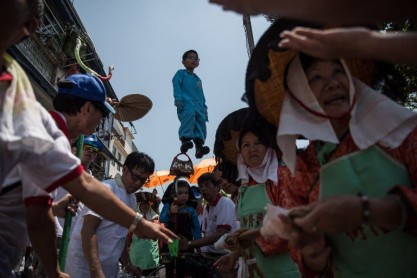 Un niño vestido como una deidad se desfiló en una carroza durante el