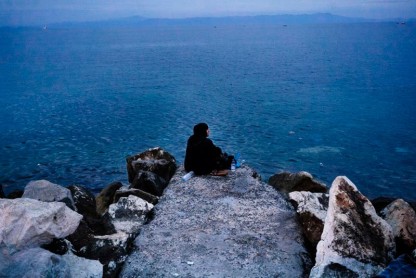 Una anciana se sienta en el espigón del puerto de Mitilene