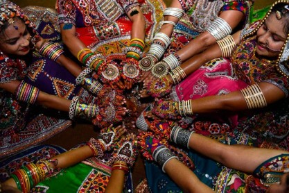 Bailarines de danza folclórica de la India muestran adornos durante un descanso durante su participación en la primera noche de Navratri en Gandhinagar