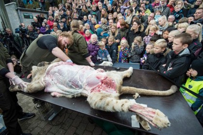 Rasmus Kolind trabaja en la disección de un león mientras visitantes del zoológico observan. Foto: AFP