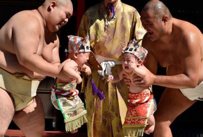Los luchadores de sumo sostienen bebés que lloran durante un evento de