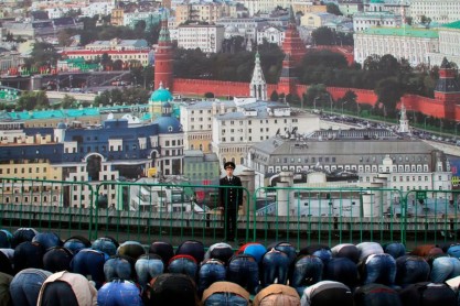 Un policía monta guardia frente a una bandera que representa el panorama de Moscú como musulmanes rezan en una calle en Moscú. Foto: AFP