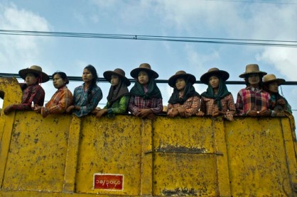 Trabajadores pasean en camión camino a su trabajo en las afueras de Yangon. Foto: AFP