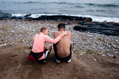 Rescatista consuela a un migrante en las costas griegas. Foto: AFP