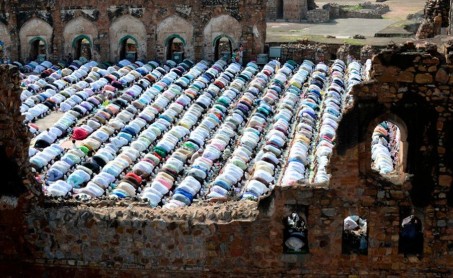 Devotos musulmanes indus ofrecen oraciones durante el festival de Eid al -Adha entre las ruinas de la mezquita Feroz Shah Kotla en Nueva Delhi. Foto: AFP