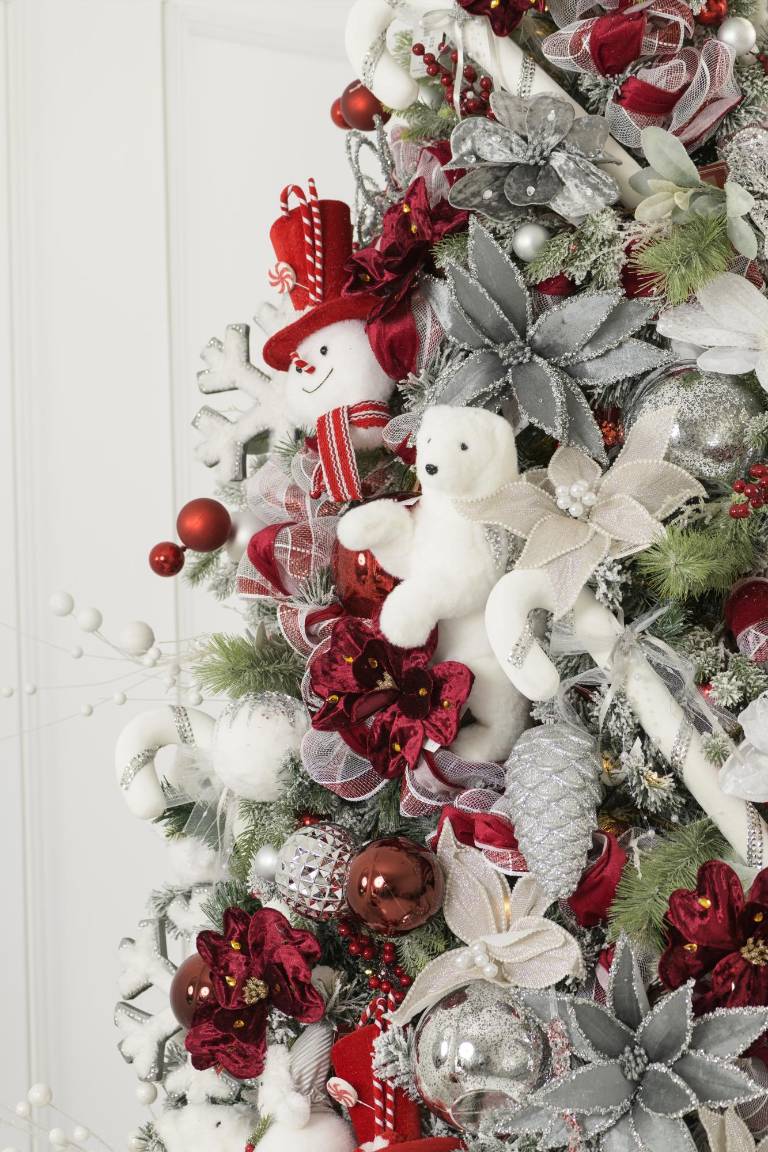 4. "Winter is here" hace referencia a la Navidad Nevada, el invierno, y aquí prima el rojo clásico de la época combinado con el plateado y blanco. Una de las principales características es que sus elementos tienen en las puntas toques blancos que simulan nieve. También hay peluches del frío, como osos polares con bufandas, ardillas, gnomos y venados. El toque de elegancia en esta decoración recae sobre detalles como las plumas, perlas, lentejuelas plateadas, y artículos de vidrio y cristales que también generan ese aspecto frío.