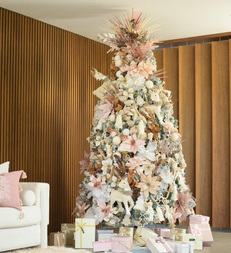 Otra de las cualidades de esta colección es que es muy versátil, tiene casitas de cerámica con acabados artesanales, copos de nieve, ornamentos y otros elementos de macramé, que hace alusión a tendencias de decoración nórdicas y europeas. En esa línea, también se pueden implementar los árboles de navidad forrados con lana, y adornados con perlas plateadas, por ejemplo. Para contrastar, se pueden incluir árboles de vidrio que son rosados pero tienen un acabado tornasol, algo que está muy de moda en vasos, copas, adornos, e incluso velas.