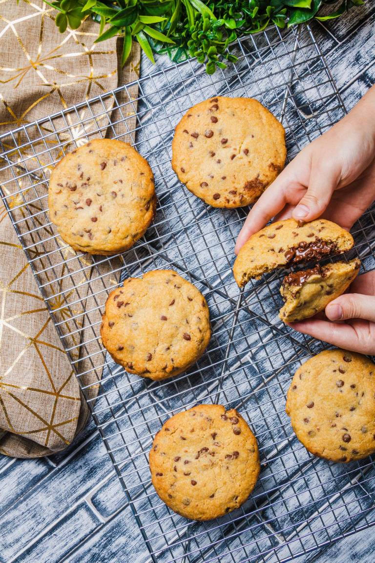 Para hacerlas más golosas ponemos dentro de cada bolita un trozo de chocolate o mezclar chispas de chocolate blanco y oscuro. Horneamos nuestras “big cookies” por 15 minutos a 170 grados. Si deseamos que estén más crocantes las dejamos por 5 minutos más.